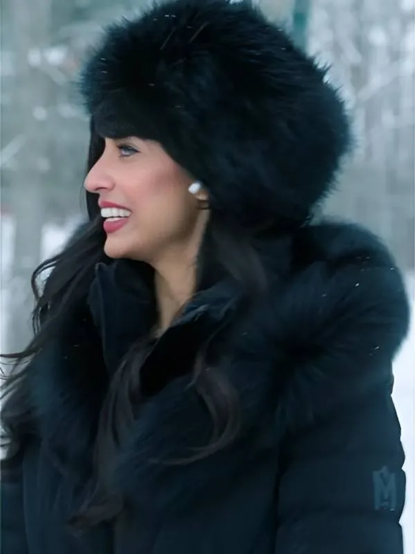 A Merry Little Ex-Mas 2025 Jameela Jamil Black Fur Trim Coat