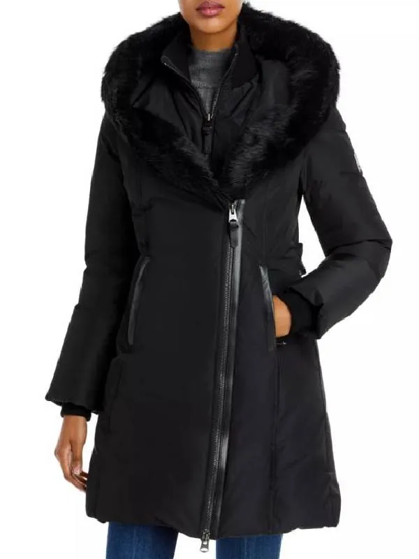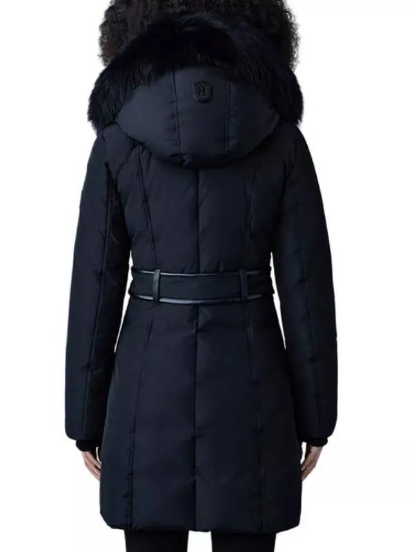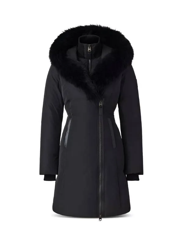 - Collar: Fixed Hood with Fixed Shearling Trim, Hidden Toggle Collar