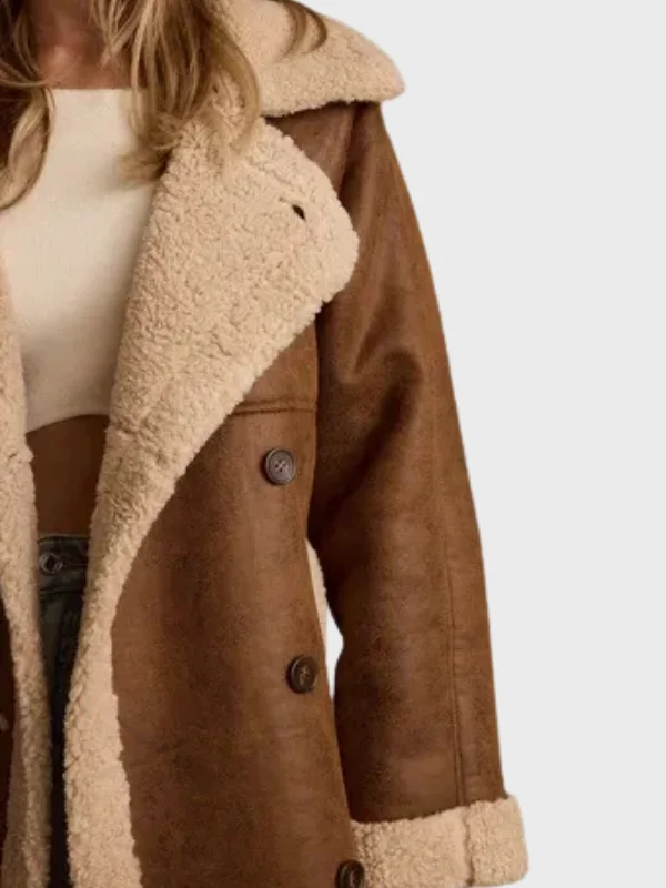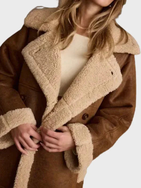 The brushed brown suede-style exterior gives the coat a soft, elevated touch while maintaining durability for everyday wear. The inner cream sherpa lining gives you warmth, which gives you an instantly comforting feel in colder weather. It’s the kind of coat that makes cold days easier and more enjoyable.
