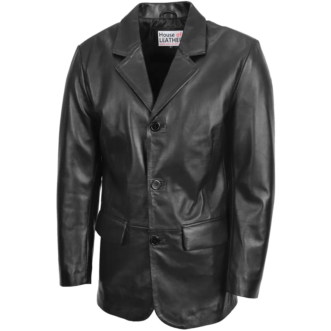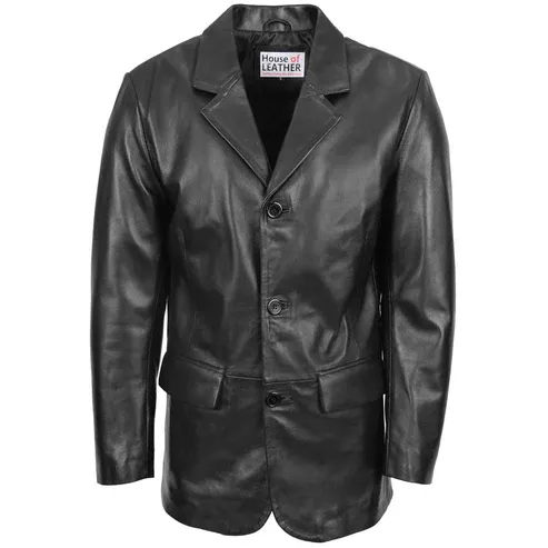 Mens Three Button Black Leather Blazer