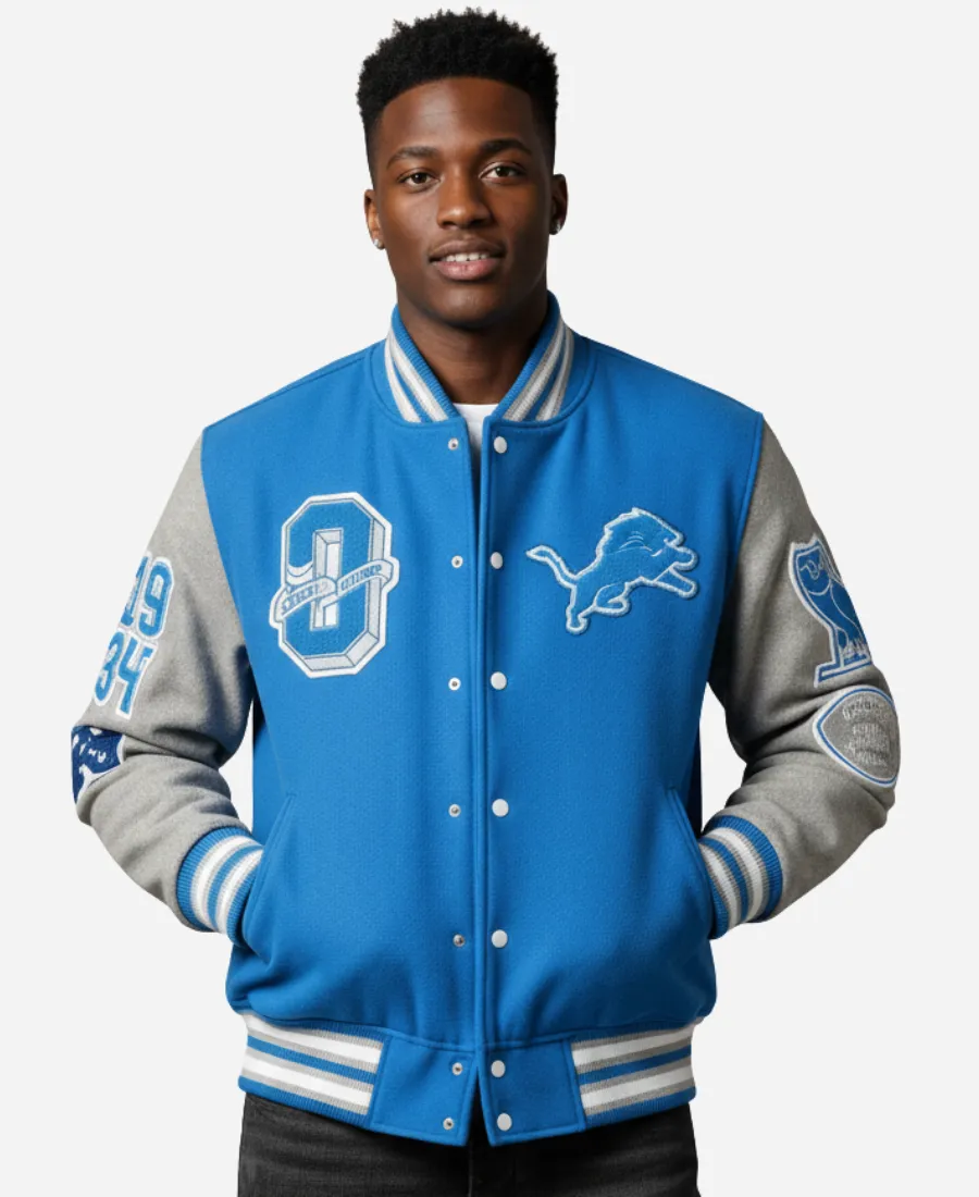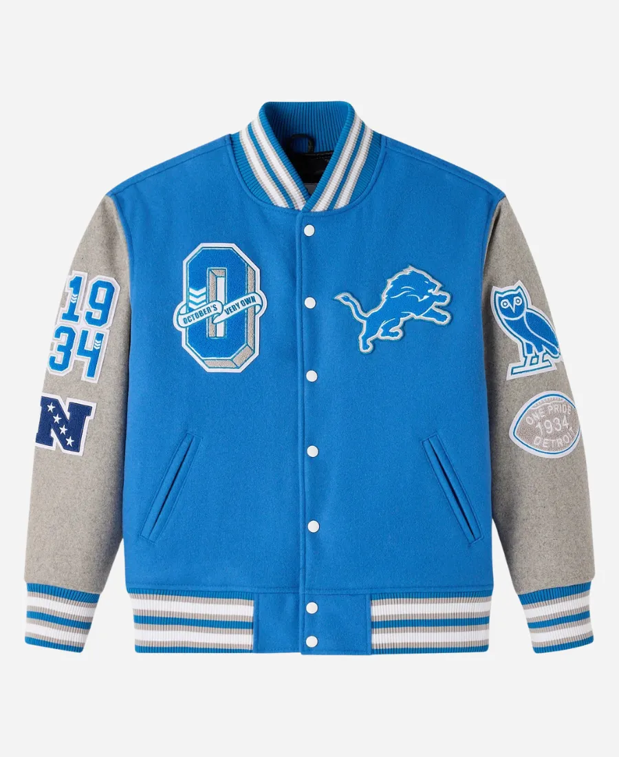 2025 October’s Very Own OVO x NFL Detroit Lions Blue Varsity Jacket