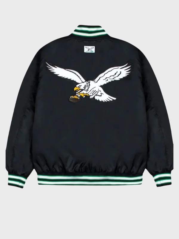 This Eagles Satin Bomber shines through its sleek black color and modern shape, which makes it easy to style with jeans, sneakers, and other outfits. It feels expressive yet refined, ideal for game days or casual outings.