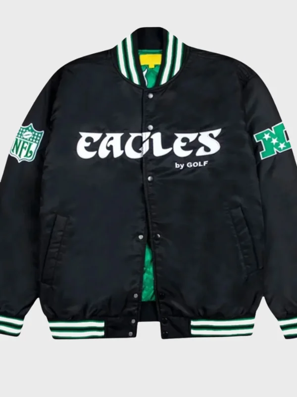 Shop Now the Unisex GOLF WANG Philadelphia Eagles Satin Full-Snap Black Bomber Jacket For Sale – Only at Real American Jackets