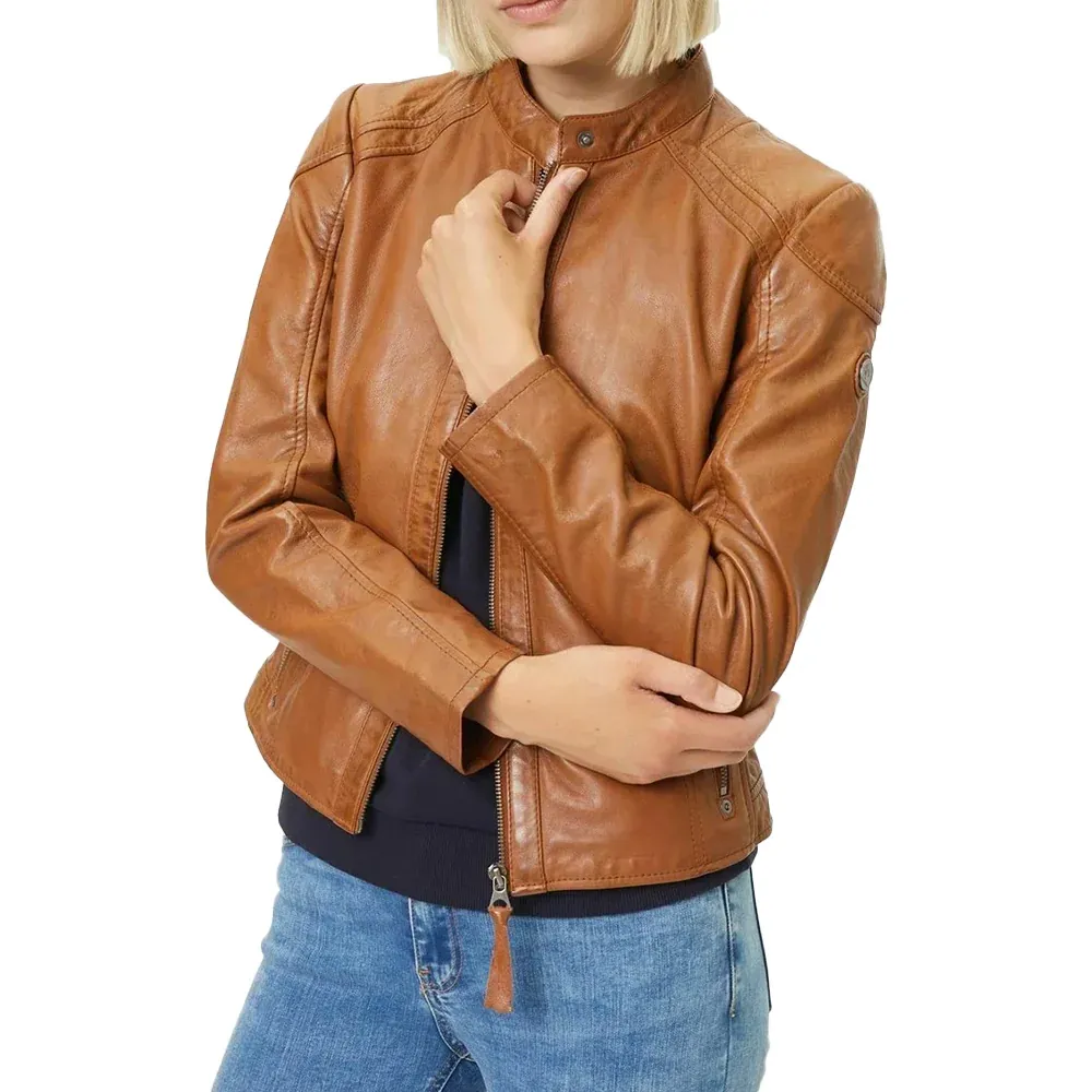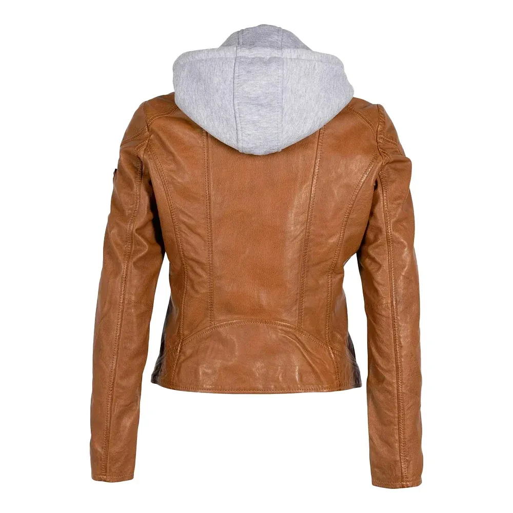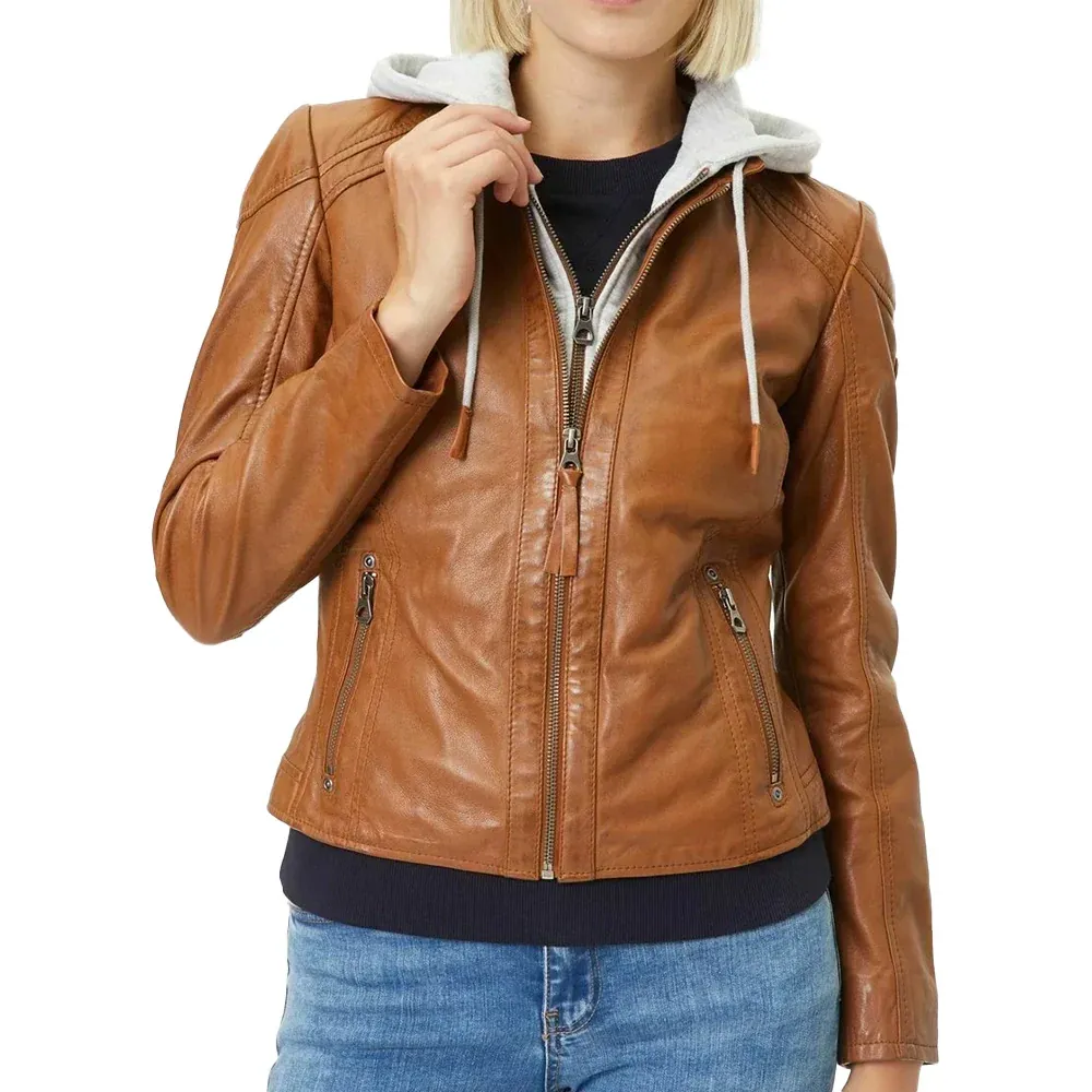 Womens Cognac Brown Leather Motorcycle Jacket with Removable Hood